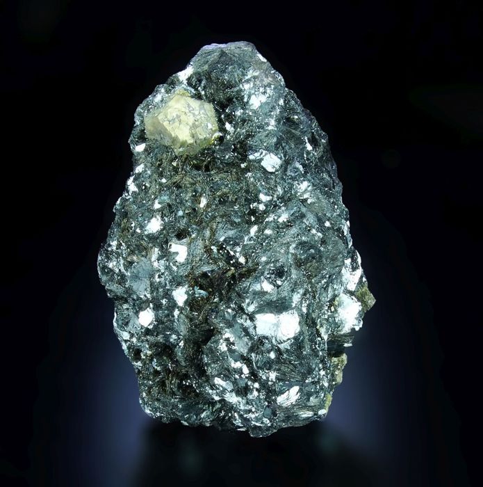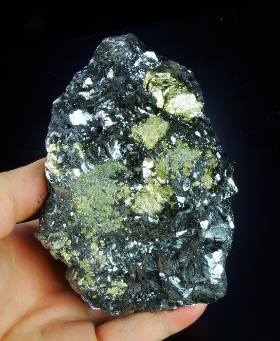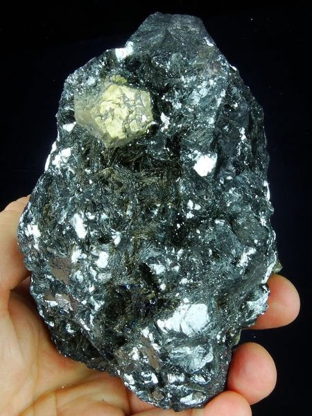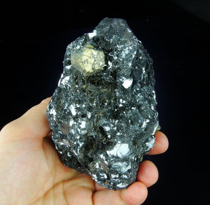 Una combinazione speciale quella di ematite e pirite. Questo cristallo, unico, prezioso e brillantissimo: cristalli di pirite incastonati su cristalli di lamelle di ematite. Ottimo esemplare da collezionisti, in quanto la formazione dei cristalli di pirite è dodecaedrica, una vera rarità in pezzi di cosi grosse dimensioni-